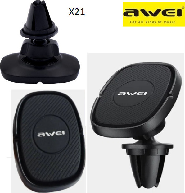 Βάση κινητού αυτοκινήτου X21 της εταιρείας Awei. Πρόκειται για τον πιο διαδεδομένο τύπο βάσης καθώς στηρίζεται στον αεραγωγό του κλιματισμού ή του καλοριφέρ αυτοκινήτου. Η στήριξη της συσκεύης στη βάση γίνεται με μαγνήτη τον οποίο μπορείτε να κολλήσετε είτε στη συσκευή σας είτε στη θήκη της. Διαθέτει περιστροφή για πιο εύκολη ρύθμιση της επιθυμητής θέσης της συσκευής.